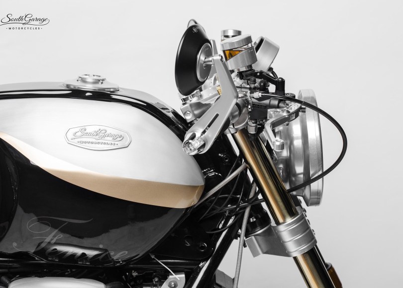 Splendida café racer “Fenice” su meccanica Moto Guzzi Bellagio , disegnata e prodotta da South Garage di Milano , arricchita di accessori di assoluta qualità , semplicemente bellissima come dire ”l’orgoglio italiano che il mondo ci invidia”. Elenchiamo di seguito caratteristiche tecniche della trasformazione , per il resto parlano le immagini.