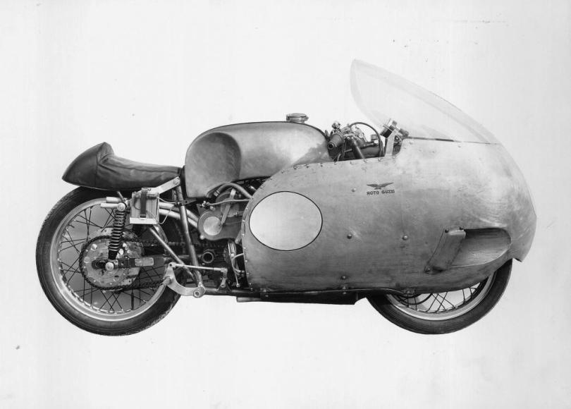 Antefatto: nel 1953 le Guzzi che partecipano al Mondiale 500 non sono più competitive: la quattro cilindri in linea longitudinale raffreddata ad acqua studiata dall’ingegnere aeronautico Carlo Gianini (lo stesso tecnico che ha ideato la Rondine CNA, dalla quale deriverà la vittoriosa Gilera 500 4 cilindri) pur essendo molto avanzata tecnologicamente con tanto di iniezione meccanica indiretta, si rivela una moto deludente e coglie scarsi risultati. Non si può aspettare anche perché la gloriosa monocilindrica dalle tante soddisfazioni sui circuiti lenti e guidati nulla può contro le quattro cilindri di Gilera e MV Agusta. Occorre intervenire e farlo in fretta. L’ingegner Carcano ha completa carta bianca dalla direzione di Enrico Parodi: non vuole replicare quanto già fatto dai concorrenti italiani e così scarta la soluzione 4 cilindri. Nemmeno un 6 in linea interessa il progettista di Mandello del Lario; neanche la soluzione a V (con i cilindri a tre a tre) è interessante perché l’equilibratura dell’albero motore avrebbe richiesto un angolo tra i cilindri di 120°, con la conseguenza di avere un motore troppo grande in lunghezza.