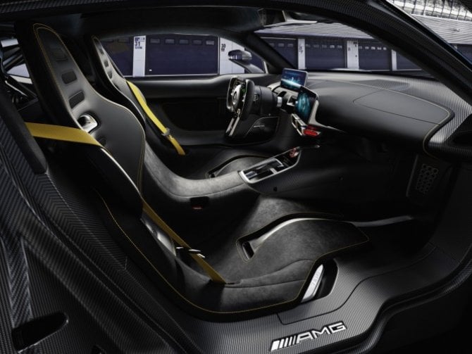 Praticamente una F1 omologata. Il livello tecnico della Mercedes AMG-One è decisamente elevato ; l’auto è dotata di un powertrain ibrido composto da un V6 1.6 e da quattro motori elettrici , molto simile a quello usato in gara dalla Mercedes W06 , la vettura campione in F1 nel 2015 con al volante Lewis Hamilton. Alla base c’è il benzina V6 di 1.6 litri , che raggiunge gli 11.000 giri e sviluppa una potenza superiore a 680 CV , collocato dietro la cabina di guida , in posizione ideale per centralizzare i pesi e rendere l’auto maneggevole e reattiva ai comandi. I tecnici motoristi hanno lavorato per aumentare la sua reattività ai comandi dell’acceleratore , inferiore secondo loro a quella di un motore aspirato V8 grazie ad una turbina elettrica.