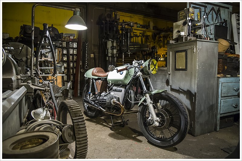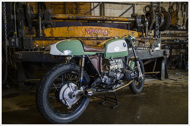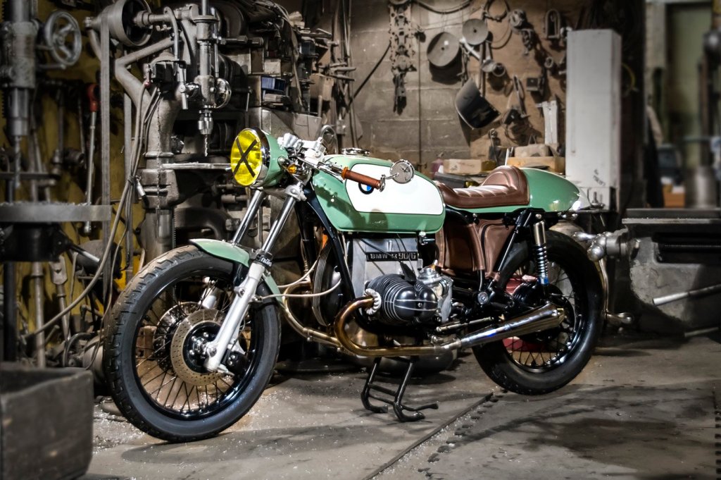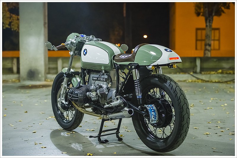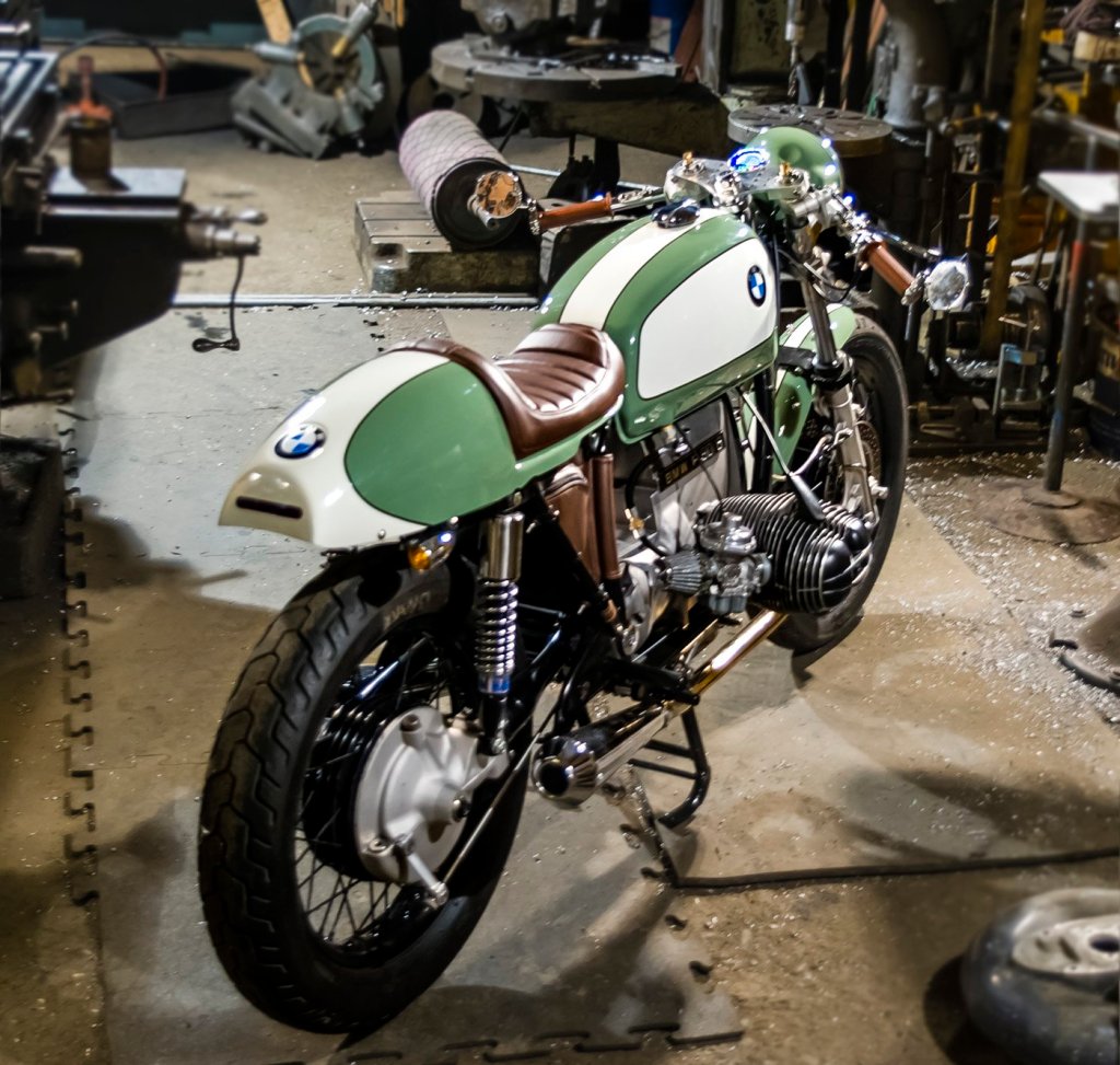 È poco amico dei motociclisti il clima dell’Alaska, 49° Stato dell’Unione, con i soli mesi estivi a concedere una tregua su due ruote agli appassionati. Erik Christensen e la sua Northern Cafe Racers, trovata una BMW R90/6 del 1974 accessoriata in modo molto kitch dal proprietario (il figlio di un dealer BMW locale), l’ha trasformata in una cafe racer adottando il tema New Vintage, che si esprime nell’acceso verde pastello e panna della carrozzeria, fortemente ispirato agli anni Sessanta. Il pinstriping marrone è opera di Perry’s Rod & Custom, di Wasilla, che è anche l’ideatore del portatarga montato sul mozzo, che negli Usa è legale. Telaio e ruote sono stati verniciati a polvere, mentre sono stati sostituiti il disco della frizione, carburatori (con una coppia di Dell’Orto da 38 mm), alternatore, e accensione Nippon Denso. Arriva anche un doppio disco anteriore, mentre il motore viene trattato con Cerakote per esaltarne la solidità. Ma le parti che più vengono sottoposte a cambiamenti sono la strumentazione e i comandi al manubrio, con clip-on Tarozzi che ora sono miniaturizzati, di origine giapponese, e marchiati Posh, e sostituiscono gli enormi comandi originali BMW. La strumentazione, invece, è firmata Acewell ed è alloggiata sulla piastra superiore realizzata da Boxer Metal. La sella monoposto, infine, è un pezzo artigianale di Stephen Grill; nel codone trova posto la piccola batteria al litio.