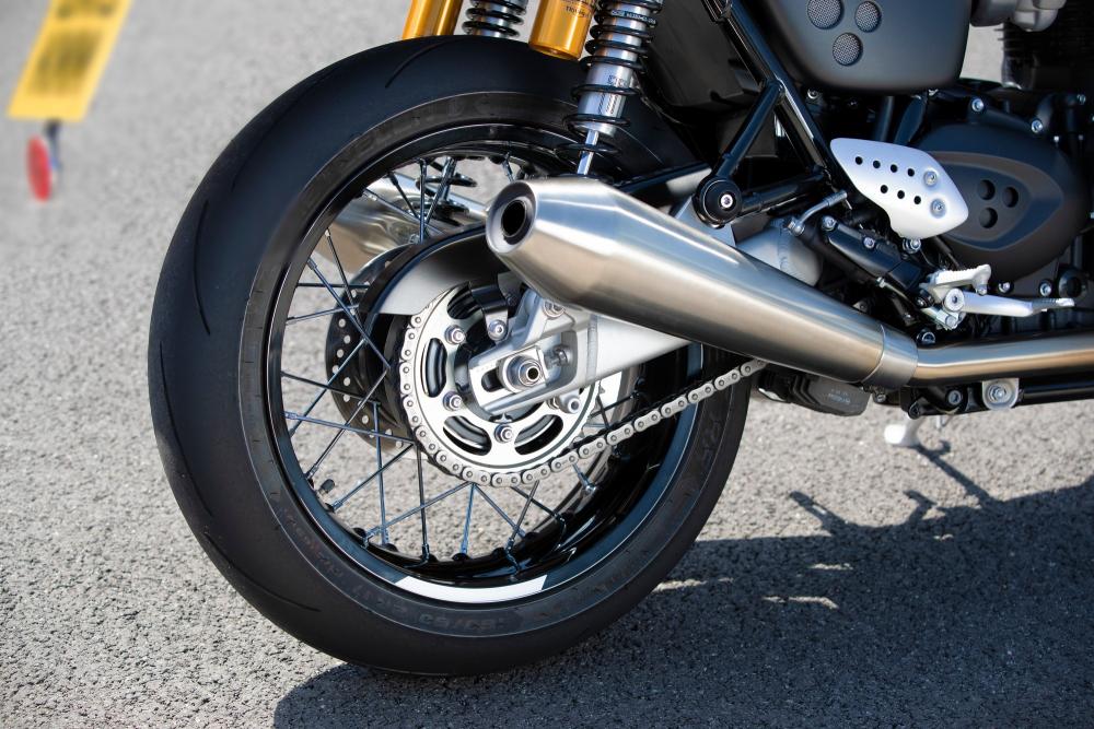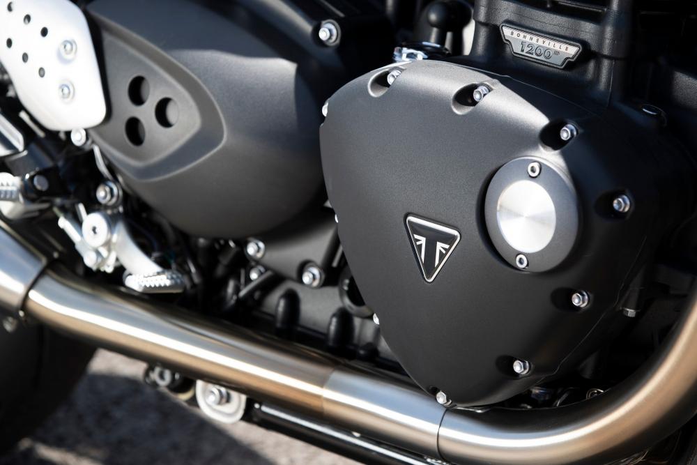 Con un lavoro di ottimizzazione e di alleggerimento, i motoristi Triumph sono riusciti a regalare al bicilindrico parallelo 1200 HT della Thruxton R ben 8 cv. Camme e condotti di nuovo profilo, pistoni ad alta compressione, albero motore più leggero, un condotto d’aria secondario, coperchi teste in magnesio sono alcune delle modifiche che hanno permesso di portare la potenza massima a 105 cv e di alzare di 500 giri il regime di rotazione.