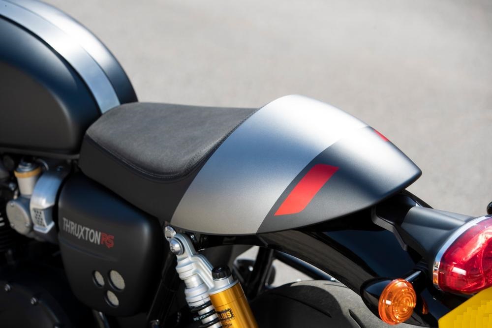 Anche il vestito della nuova Thruxton RS è differente da quello della R. Guadagna infatti un po’ di cattiveria grazie al nero di cerchi, carter, coperchi valvole, frecce, specchietti e molle degli ammortizzatori, alle pedane Daytona e ai semi manubri da 22 mm. La configurazione di serie prevede il codino monoposto e le colorazioni proposte sono la classicissima Jet Black e la più particolare Matt Storm Grey/Matt Silver Ice.