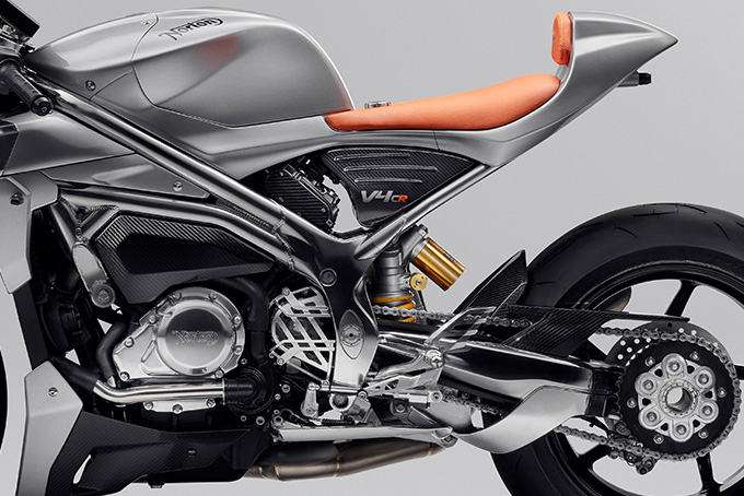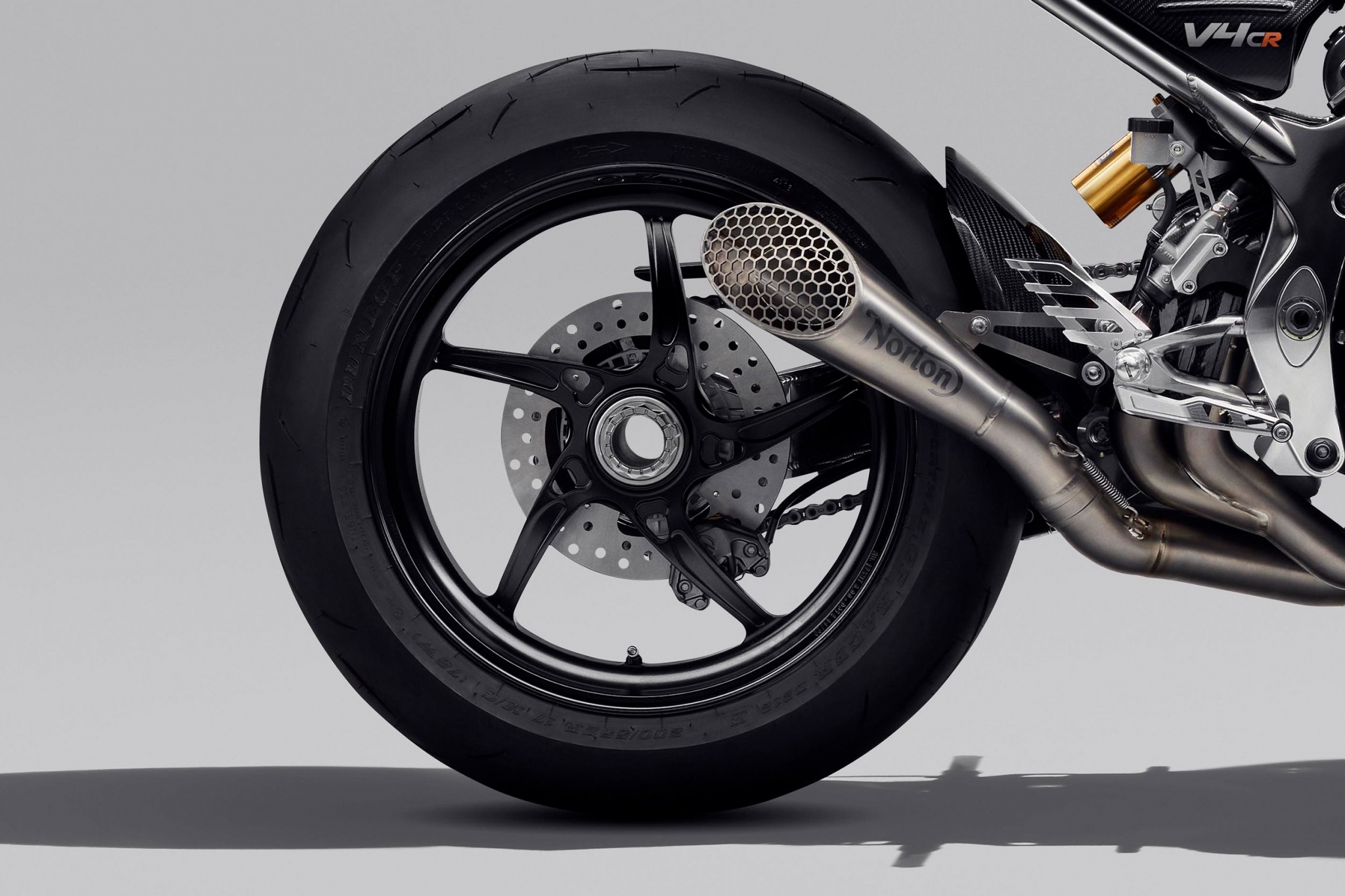 L’impianto frenante è invece firmato Brembo e anteriormente è caratterizzato da una coppia di pinze monoblocco pronte a mordere due dischi da 330 mm. Il serbatoio da 15 litri si sviluppa invece sotto la sella. Una soluzione pensata per centrare le masse e abbassare il baricentro della moto (anche se guardando le immagini del concept della V4 CR sembrerebbe che questo sia di tipo tradizionale). Il peso in ordine di marcia dichiarato per la V4 SV, liquidi esclusi, è di 193 kg. Questo ci fa pensare che, nell’eventualità in cui tutte queste caratteristiche siano effettivamente confermate anche sulla nuova hypernaked, il peso possa essere addirittura inferiore, grazie all’assenza di sovrastrutture. Niente male per una moto che incastonato nel telaio ha un motore da 1.200 cc.. Tolta la sigla CR, che in Casa Norton significa “Cafè Racer”, la naked sfoggerà lo stesso propulsore della sorella carenata, abbinandolo, immaginiamo noi guardando le immagini, alla stessa preziosissima ciclistica, con forcellone monobraccio in alluminio, sospensioni interamente Öhlins, cerchi Bst e impianto frenante firmato Brembo. Particolarità della CR dovrebbe però essere il larghissimo uso del carbonio, scelto dai tecnici inglesi sia per il serbatoio che per le sovrastrutture. Un modello prezioso che, esattamente come la sorella carenata, avrà un prezzo salato: “la V4 CR – ha detto lo stesso CEO Robert Hentschel – è il prossimo passo di Norton verso il suo obiettivo: diventare leader mondiale delle moto artigianali di lusso”…
