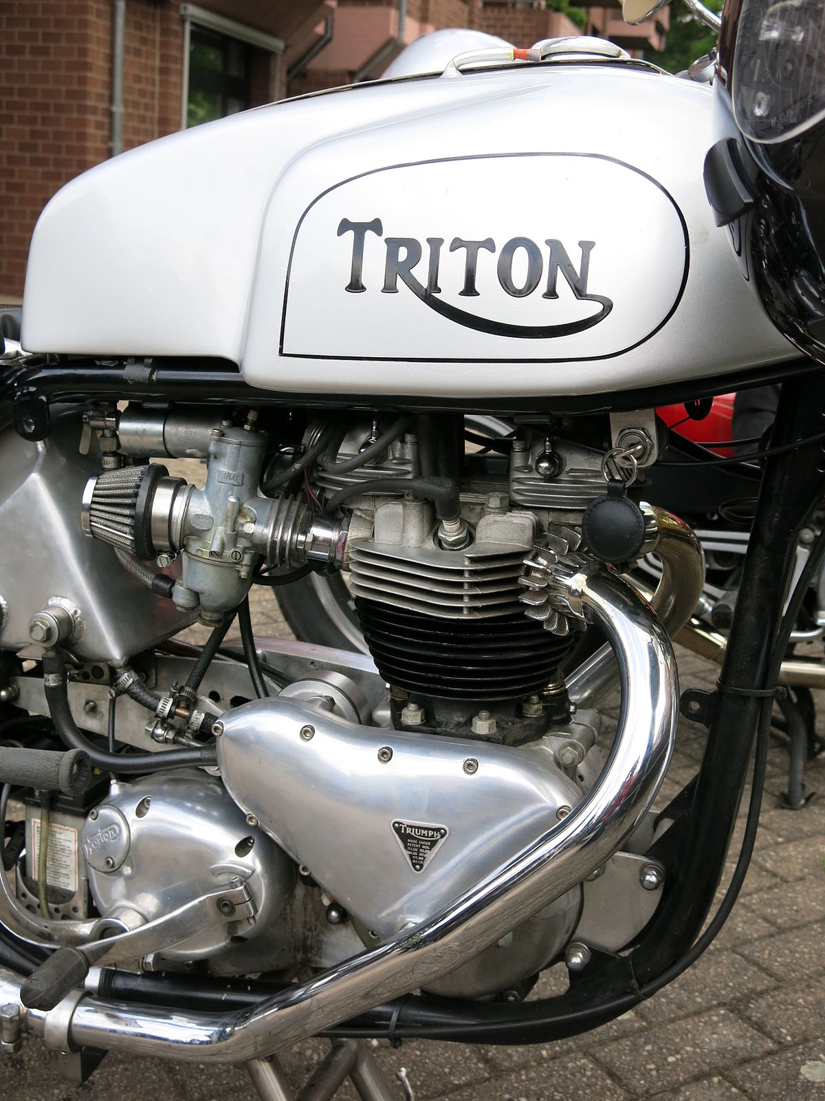 Il modo più economico per avere una Triton era sostituire da una motocicletta Norton il motore con uno Triumph lasciando inalterata la ciclistica. Poi secondo il budget a disposizione si montavano il serbatoio dell’olio e della benzina in alluminio, Il freno anteriore Manx, i cerchi in alluminio, i carburatori Amal GP in magnesio, i collettori di scarico più rastremati chiamati swept-back con le marmitte del Gold Star che avevano un suono particolare. Al posto dei supporti del faro anteriore originale si metteva quelli di John Tickle che aveva a catalogo tante altre parti come pedane arretrate, mezzi manubri ed altro. All’inizio degli anni sessanta il Norton Manx non era più molto competitivo e con l’avvento di una nuova categoria di auto monoposto da competizione Cooper motorizzata dal motore Manx, sul mercato si trovavano delle ciclistiche complete a poco prezzo. Le persone più agiate mettevano dentro un motore Triumph ed ecco un bella TRITON con estetica e ciclistica da corsa .