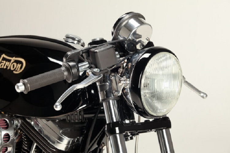 Il serbatoio dell’olio è stato realizzato da zero, così come la tradizionale sella in stile cafè racer. Il parafango posteriore ospita solo una piccola luce di stop in stile Vincent. Il parafango anteriore è modificato per adattarsi alle forcelle Marzocchi. Appena sopra c’è il faro di una Moto Guzzi T3, tenuto da due staffe Tomaselli. Il front-end è straordinariamente semplice; un paio di semi-manubri, un gruppo acceleratore Amal e comandi in stile classico.
