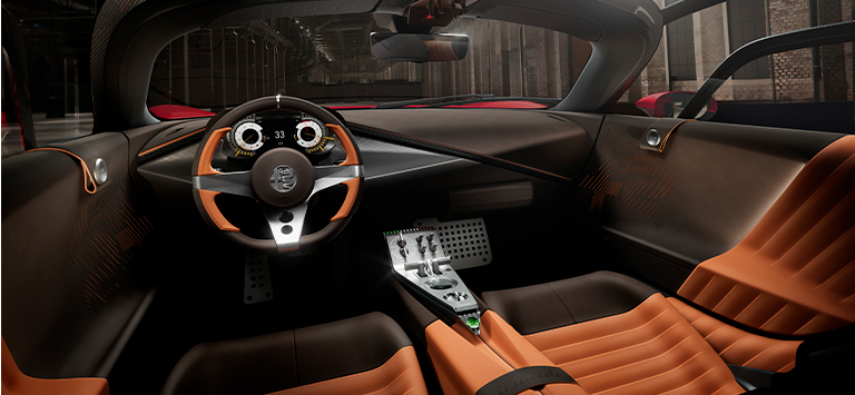 Disponibile in versione “Tributo” e “Alfa Corse” la nuova supercar del Biscione ha come scopo quello di massimizzare il piacere di guida eliminando ogni elemento superfluo. Sulla console centrale e sulla plafoniera del tetto sono presenti i comandi fisici per le modalità di guida mentre le varie informazioni vengono visualizzate sul monitor davanti al guidatore, il cui stile riprende quello a cannocchiale delle Alfa Romeo del passato.