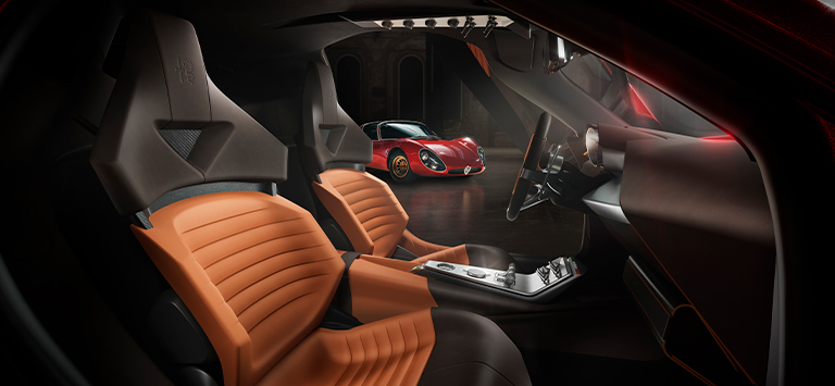 Tutto intorno ci sono materiali ricercati come fibra di carbonio, Alcantara e pelle Poltrona Frau per i sedili, il cui disegno è un chiaro richiamo a quelli della 33 Stradale originale.