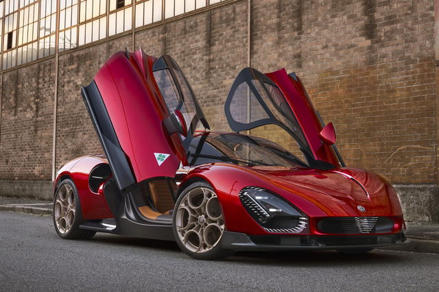 Ma veniamo ai motori: la 33 Stradale benzina è mossa dal V6 3 litri biturbo da più di 620 CV della MC20 (chiamato Nettuno) a sua volta derivato da quello delle Giulia e Stelvio Quadrifoglio, sistemato in posizione centrale e abbinato al cambio DCT a 8 rapporti e alla trazione posteriore. I dati ufficiali parlando di 333 km/h di velocità massima e meno di 3″ per passare da 0 a 100 km/h.