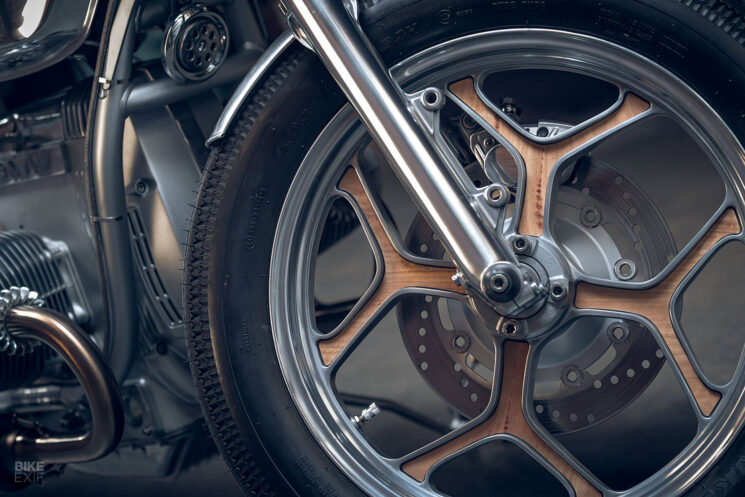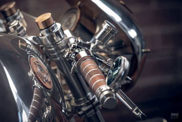 Andrew ha anche modificato e montato un set di pedane posteriori Cognito Moto e ha installato un parafango anteriore minimalista. Le ruote sono state liberate dai segni di fusione e quindi trattate con una miriade di finiture, comprese sezioni opache, spazzolate e lucidate. Sottili intarsi in legno aggiungono un tocco aeronautico senza esagerare.