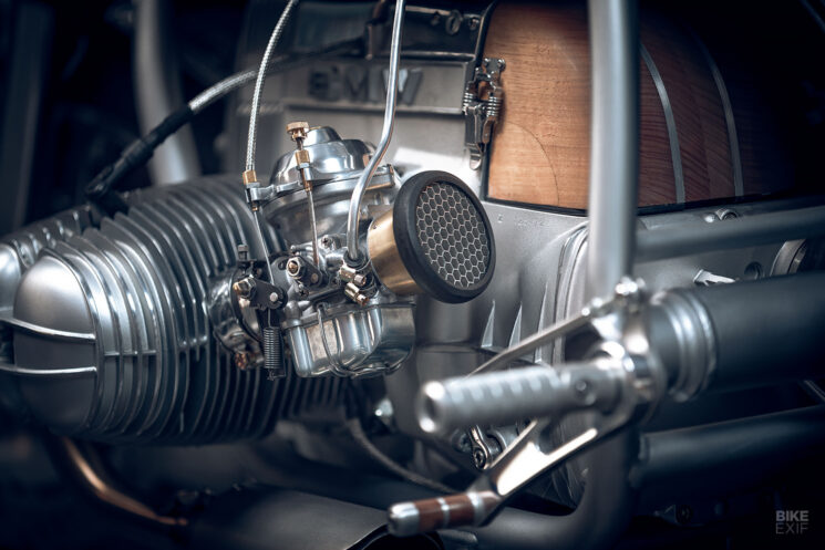 Maggiori dettagli si rivelano man mano che ti avvicini. Una piastra di legno chiude lo spazio tra la parte posteriore del serbatoio e la parte anteriore del sedile, mentre una scatola di legno fatta a mano si trova dove un tempo si trovava l’airbox, ora ospita la batteria. Ogni parte indossa gli stessi inserti in alluminio, così come le manopole fatte a mano, il pomello del pedale del freno e il pomello del cambio.