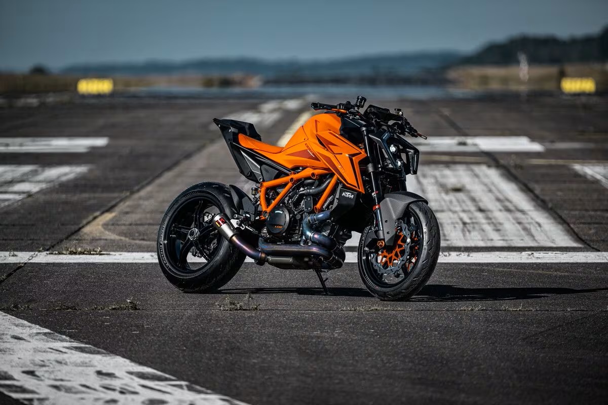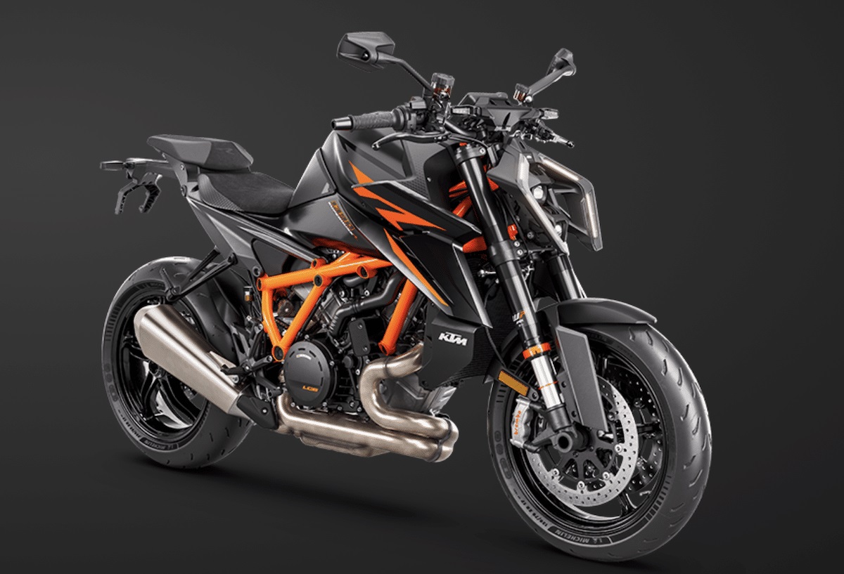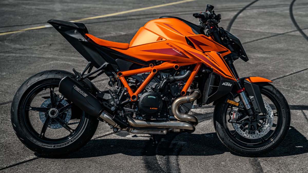 Il progetto Super Duke debuttò nel 2006, anno in cui Ktm presentò una naked molto performante, pensata per l’uso su strada. Nel 2014, la prima evoluzione tecnica a cui seguì nel 2020, la seconda, oggi Ktm ha superato se stessa ha creato la Super Duke più potente della storia; una superbike senza carene, che alla strada preferisce i cordoli del circuito, una bicilindrica esagerata sotto ogni punto di vista, è diventata un’antagonista dell’Aprilia Tuono V4 e della Ducati Streetfighter V4, nude col manubrio alto che si divertono a infastidire le maxi sportive dotate di semimanubri e carene avvolgenti. Ktm propone due versioni della 1390 Super Duke; la R, dotata di sospensioni meccaniche; la R Evo, equipaggiata con sospensioni semi attive; tutte e due le versioni, di serie, offrono il sensore per monitorare la pressione degli pneumatici e il Cruise Control. Per il piacere dei suoi clienti Ktm offre alcuni optional irrinunciabili dagli smanettoni: i Riding Modes Performance e Track (possibilità di selezionare mappature diverse del propulsore), Suspension Pro (variare taratura sospensioni in tempo reale) e Quickshifter+ (consente di salire e scendere di marcia senza la necessità di tirare la leva della frizione). Nel catalogo Power Parts, sono inoltre disponibili numerosi componenti, tra cui vanno citati un impianto di scarico, che Ktm ha sviluppato in collaborazione con Remus e Akrapovic, componenti in carbonio e in alluminio anodizzato, componenti per l’impianto frenante e chi più ne ha, più ne metta. Insomma, è possibile customizzare una moto molto esclusiva. Due i colori disponibili: arancione e nero (con telaio arancione).