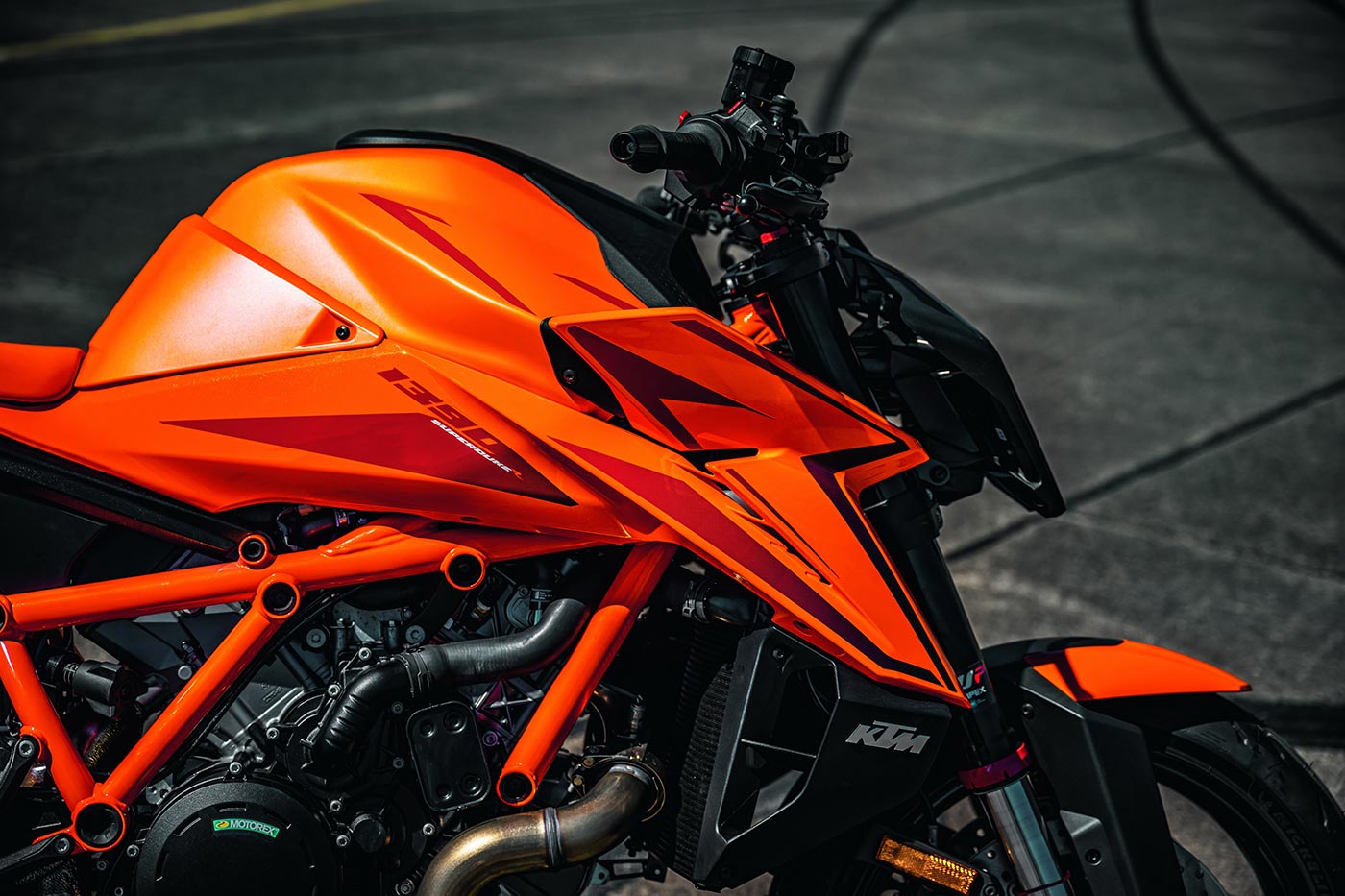 Il motore LC8 resta l’attore protagonista. La Super Duke 1390 R non è la naked più potente del mercato, però i suoi numeri impongono rispetto, soprattutto perché stiamo parlando di un bicilindrico, un motore che spinge forte anche ai regimi medio-bassi; un motore che ormai sta lottando contro i quadricilindrici a V di Aprilia e Ducati e i quadricilindrici in linea di Bmw e Kawasaki.Il V2 austriaco ha raggiunto quota 190 Cv a 10.000 giri/min e una coppia di 145 Nm a 8.000 giri/min; merito della cilindrata, portata a 1.350 cc (+49 cc) grazie all’aumento dell’alesaggio (passato da 108 a 110 mm) e di nuovi alberi a camme, che consentono due alzate separate delle valvole a seconda regime di rotazione; un sistema di fasatura variabile della distribuzione inedito e semplice, che ha consentito di contenere l’aumento di peso. Questa Ktm ferma la bilancia a 200 kg a secco; il rapporto peso/potenza, quindi, è molto vicino a 1:1. Tanti cavalli tanto calore da smaltire ma nessun problema, perché Ktm ha adottato un radiatore più grande, che permette al motore di lavorare alla corretta temperatura d’esercizio in qualsiasi condizione di utilizzo, anche il nuovo airbox è stato ridisegnato, è più capiente ed è abbinato a corpi farfallati con diffusori da 60 mm Ø. La capacità del serbatoio della benzina e di 17,5 litri. Il nuovo propulsore delle 1390 Super Duke R e 1390 Super Duke R Evo rispetta l’omologazione Euro 5+