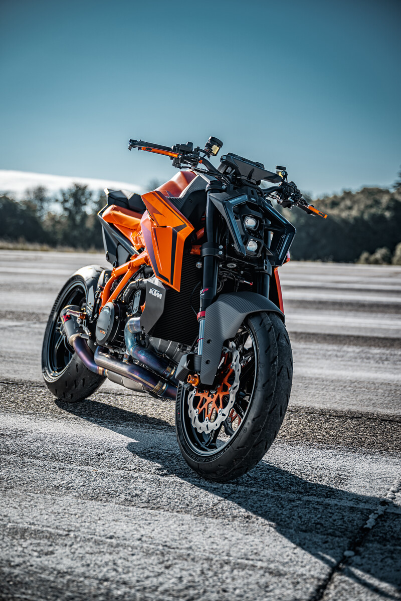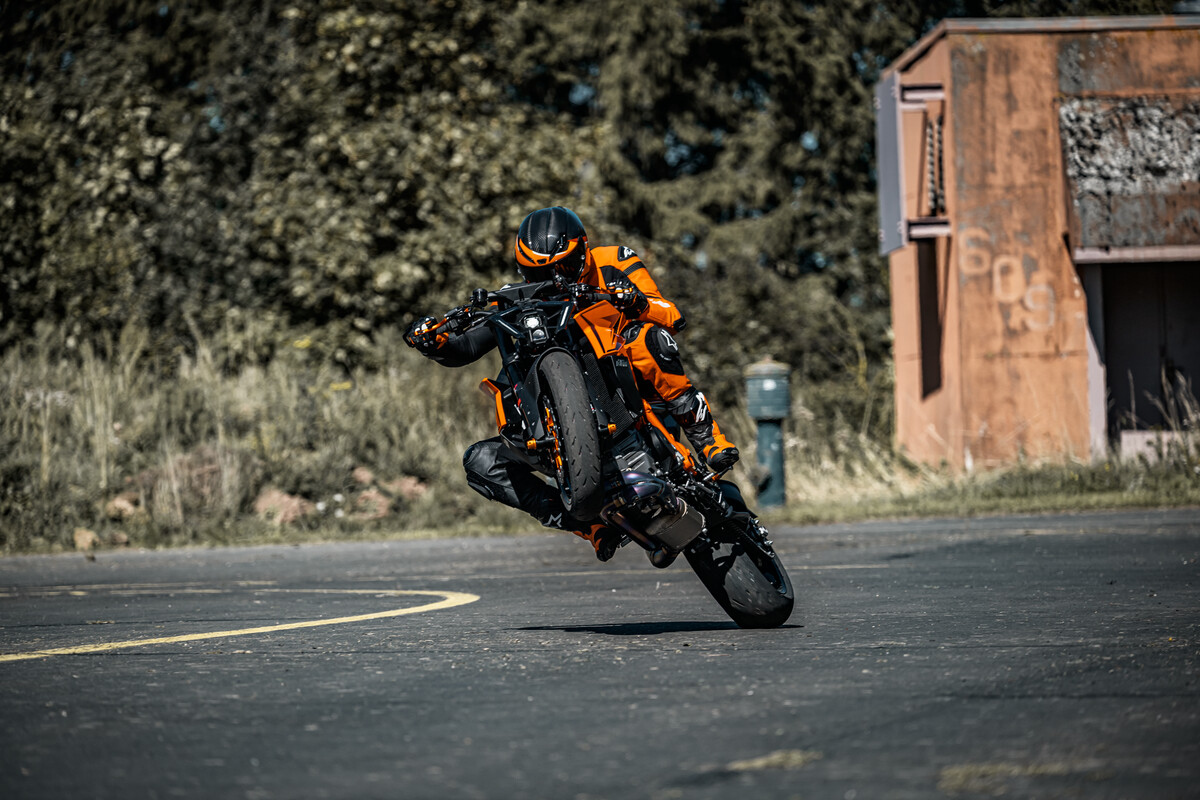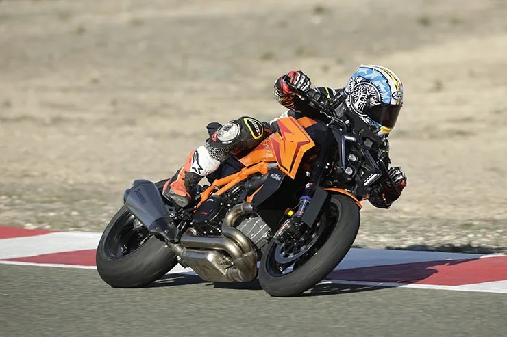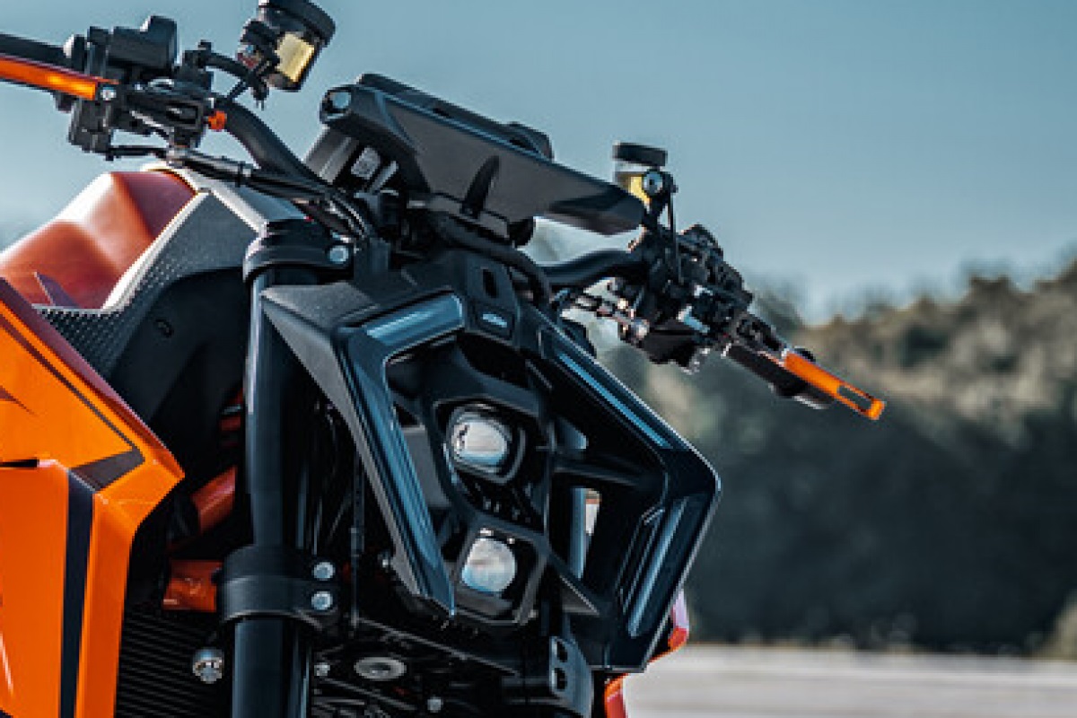 La centralina (con piattaforma inerziale a 6 assi) che gestisce la nuova elettronica si trova nella parte finale del codino, pressofuso in alluminio. Per mettere a punto il sistema, Ktm ha svolto numerose prove in pista insieme a Jeremy McWilliams (pilota del motomondiale anni 2000). Tutte le funzioni si possono tenere sotto controllo tramite il display Tft a colori da 5”, dotato di presa Usb-C per la ricarica del cellulare, che si può connettere alla strumentazione per gestire le chiamate e le playlist musicali. Il pacchetto elettronico di serie include le modalità di guida (Riding Modes) Rain, Street, Sport e il sistema per monitorare la pressione degli pneumatici. I Riding Modes Performance e Track sono optional e aggiungono la possibilità di controllare il freno motore (5 livelli d’intervento), il controllo dell’imbardata (9 livelli d’intervento che si possono modificare anche durante la guida, tramite due tasti sul blocchetto sinistro) e l’anti impennata (5 livelli d’intervento). Attivando la modalità Supermoto, si può disattivare l’Abs (di tipo Cornering) al retrotreno. Anche il Quickshifter+ è disattivabile, sebbene non abbia alcun senso farlo, dato che funziona meravigliosamente e, soprattutto nell’uso in pista, è molto utile. Su una moto così potente non poteva mancare il Launch Control, che può essere abbinato al Factory Start (disponibile all’interno del pacchetto Suspension Pro), un abbassatore in stile MotoGP che in fase di partenza esalta il rendimento del Launch Control. Non ci si deve aspettare una riduzione dell’altezza del retrotreno paragonabile a quella di una MotoGP ma questo sistema rappresenta un primo passo verso l’introduzione di sistemi evoluti di aiuto alla partenza. Il Factory Start non si può usare durante la guida; subito dopo la partenza, l’altezza del retrotreno torna al valore preimpostato.