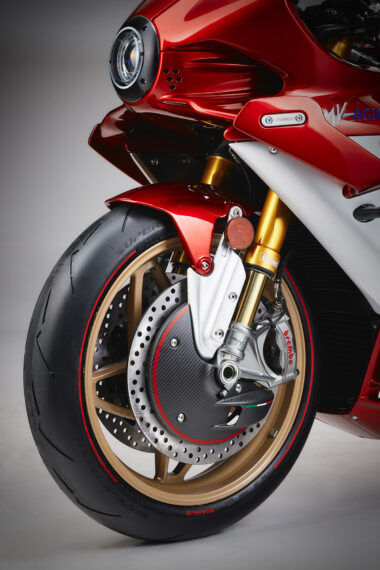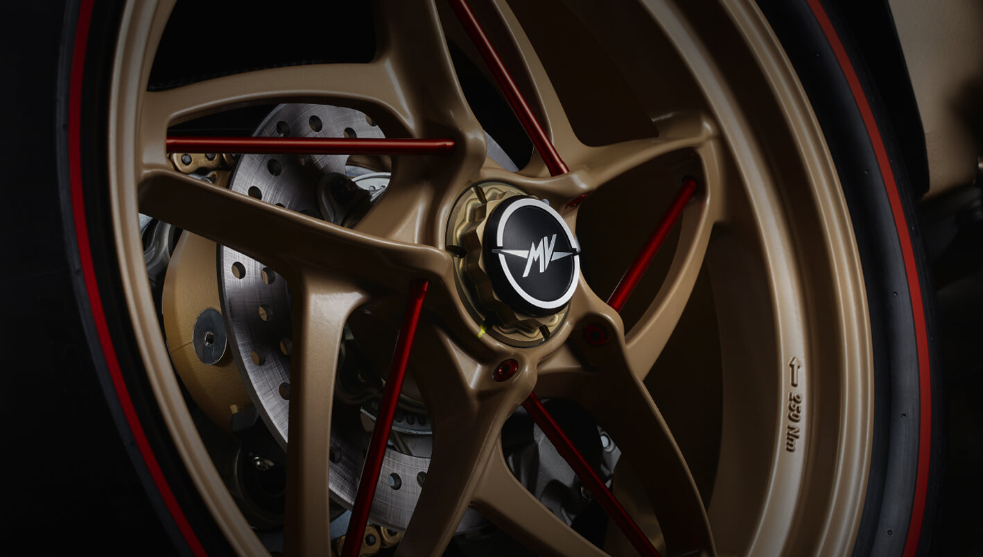 L’ispirazione per gli iconici cerchi deriva dalla stella stilizzata che caratterizzava quelli della leggendaria MV Agusta F4 750 Serie Oro, reinterpretati però tramite un esercizio stilistico che fa da ponte tra passato e futuro che vede le razze in alluminio combinate a raggi radiali.