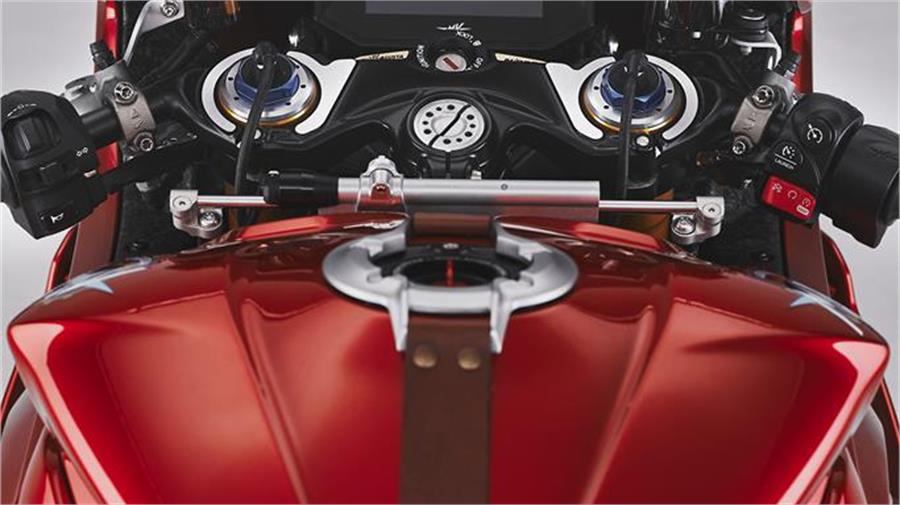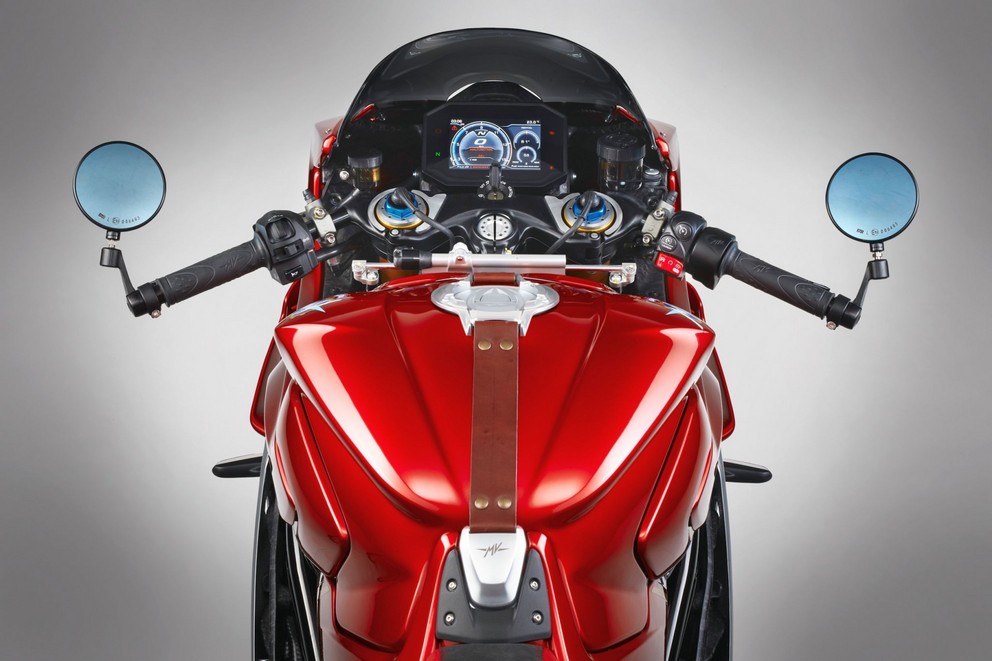 La ricercatezza nell’utilizzo di materiali pregiati è evidente in ogni dettaglio della Superveloce 1000 Serie Oro. La sella, ad esempio, oltre ad essere stata disegnata con l’obiettivo di garantire il più alto comfort combinato con un’ergonomia ottimale, è realizzata in pelle e Alcantara, materiali chiaramente appartenenti al mondo del lusso, e porta il distintivo fregio MV.