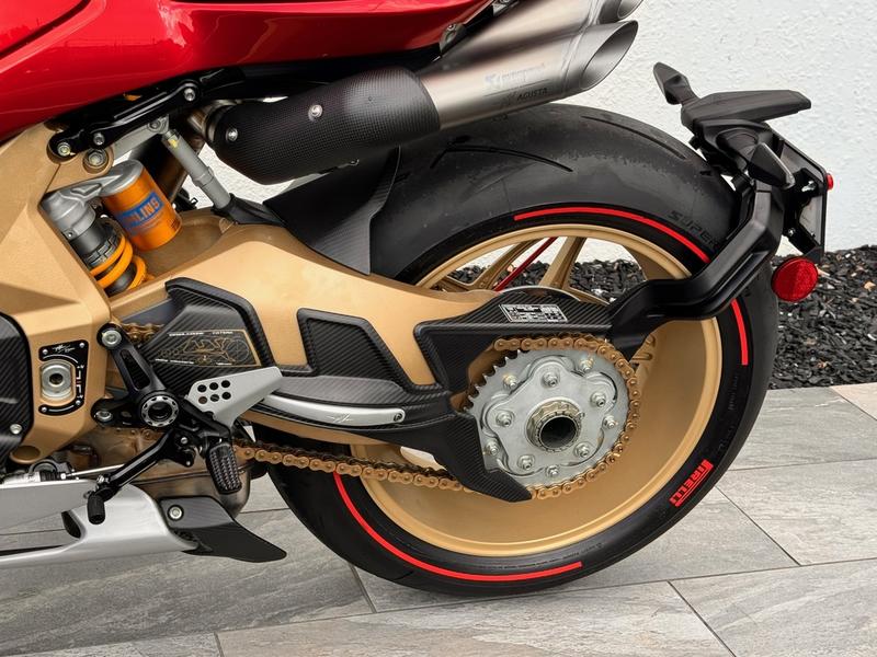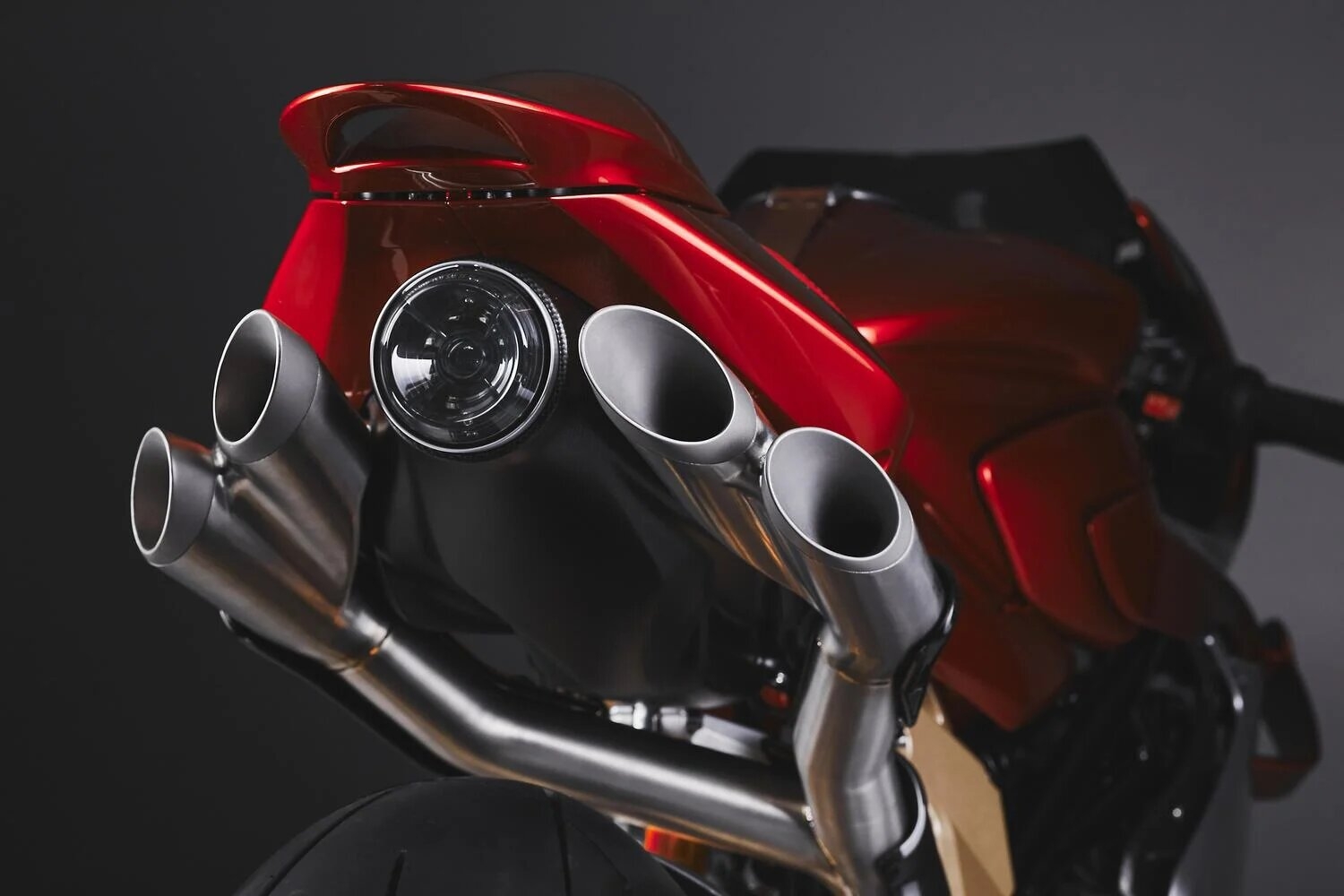 L’omaggio alla F4 è evidente anche nella scelta dello scarico con terminale a 4 uscite in titanio sviluppato da Akrapovic appositamente per la Superveloce 1000 Serie oro. Questo scarico realizzato nella sua caratteristica forma a “canne d’organo” e accordato per conferire alla moto un suono iconico e distintivo, è ulteriormente impreziosito dalla presenza del paracalore in carbonio.