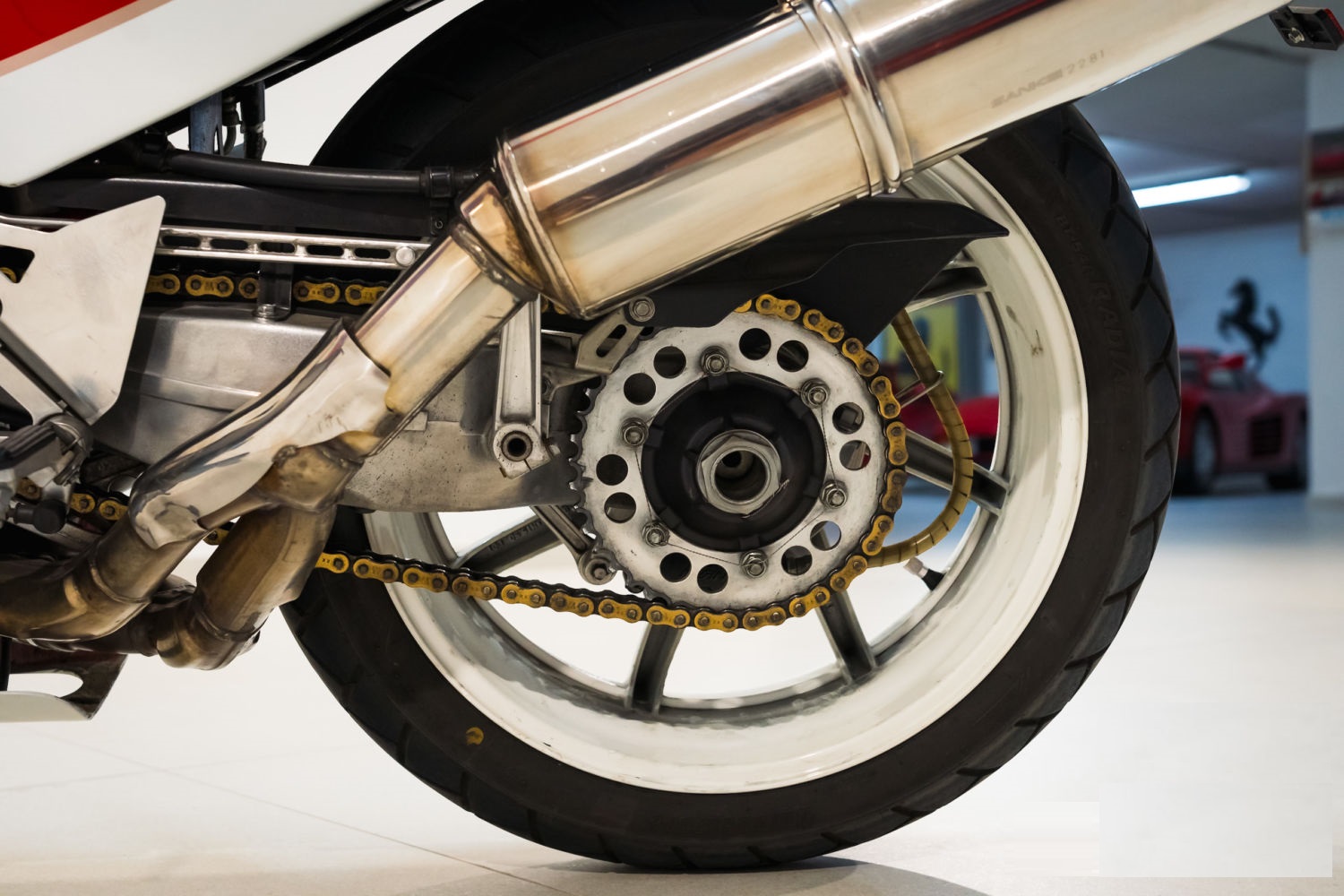 La frizione, il cambio, l’albero motore, la pompa dell’olio, le bielle, la pompa dell’acqua, i pistoni, motorino di avviamento, l’intero corredo valvole e le testate erano specifici per l’RC30. La distribuzione a cascata di ingranaggi era qualcosa di davvero unico: garantiva una potenza elevata e una risposta rapida, ideale per i circuiti più impegnativi. La configurazione V4, inoltre, assicurava un’erogazione di coppia fluida e progressiva, che contribuiva alla guidabilità della moto anche nelle situazioni più critiche.