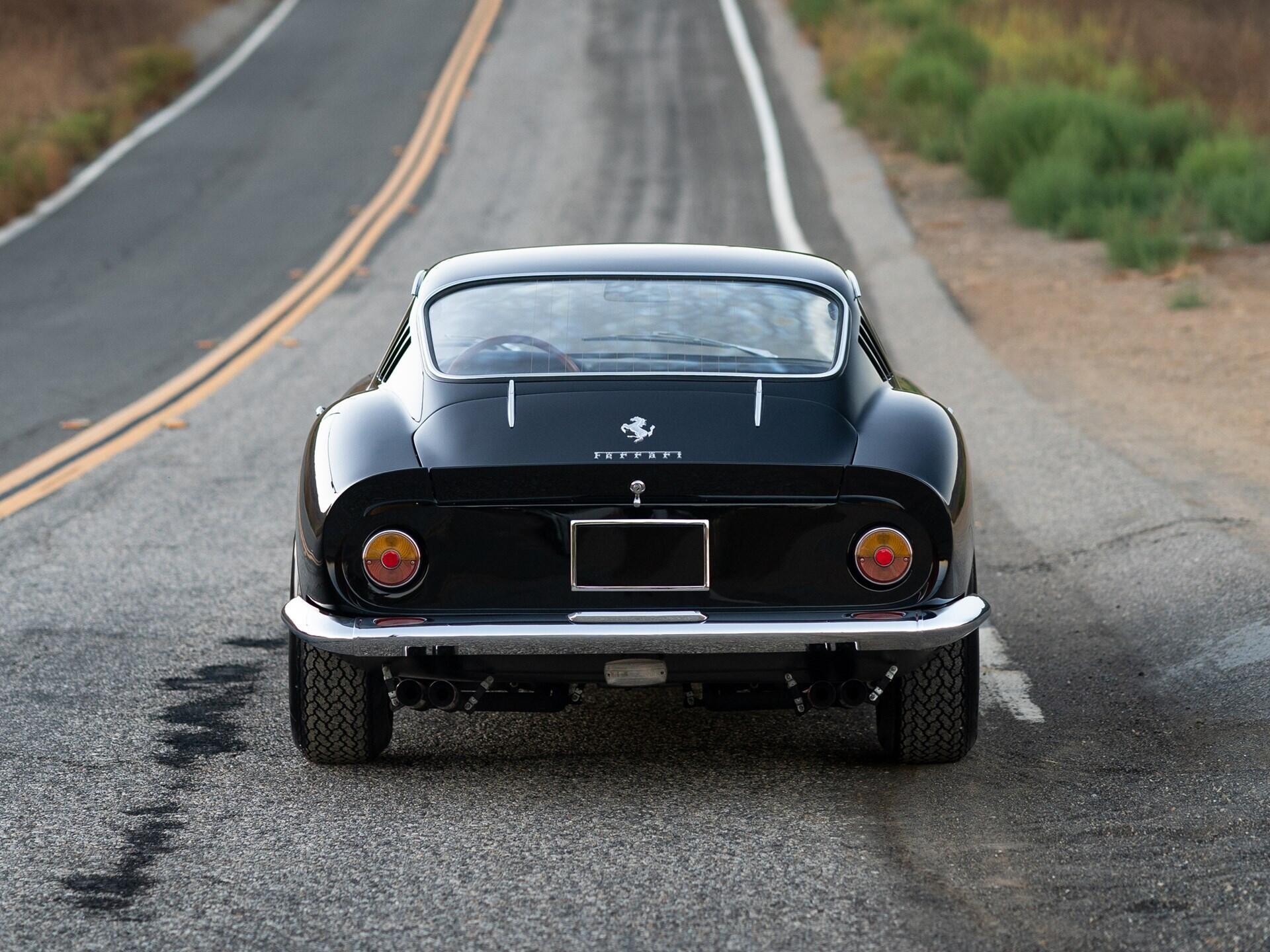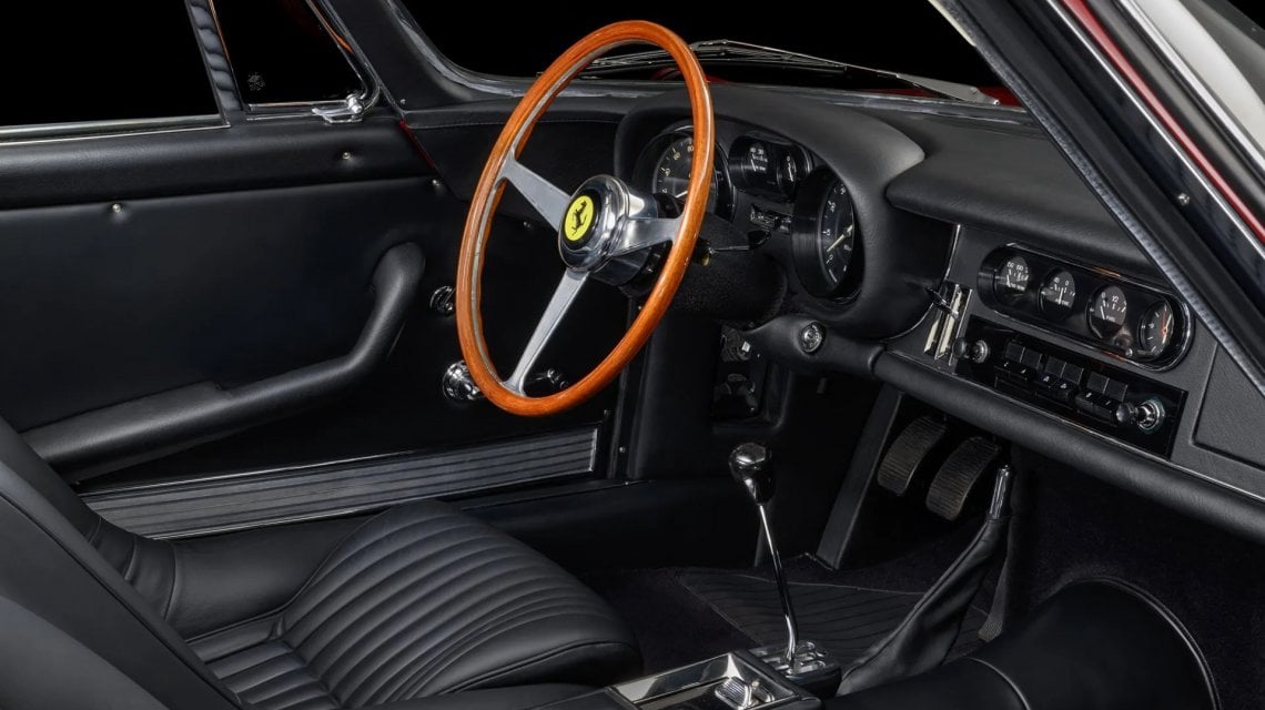 A rendere più grintoso il profilo laterale contribuivano quattro feritoie nella carrozzeria dietro le ruote anteriori subito davanti alle portiere simili a quelle della mitica 250 GTO, e tre ai lati del lunotto posteriore. La griglia anteriore è tipica dei modelli Ferrari dell’epoca, con il celebre stemma del cavallino rampante al centro.