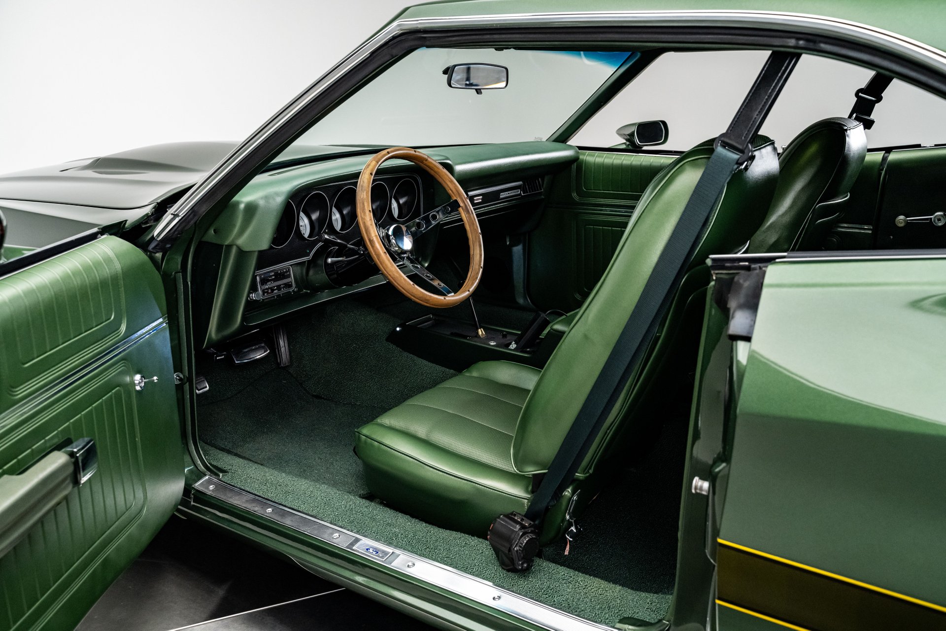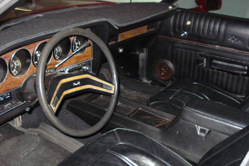 Ora anche il volante risulta essere bello a vedersi, ma poco preciso come ci si aspetterebbe da una sportiva dura e pura come questa Ford Gran Torino. CI si siede in basso è vero, ma si viene subito avvolti da una plancia con inserti in pelle e radica che dimostrano il lusso di questa vettura. Il fiore all’occhiello degli interni è il contachilometri posto davanti al guidatore poiché è caratterizzato da quattro cerchi identici in design orizzontale che forniscono tutte le informazioni necessarie. Nella parte centrale del tunnel si trovano le leve del clima, la radio ed i comandi necessari per i più importanti controlli della Gran Torino. Proprio lì davanti si trova la leva del cambio automatico.