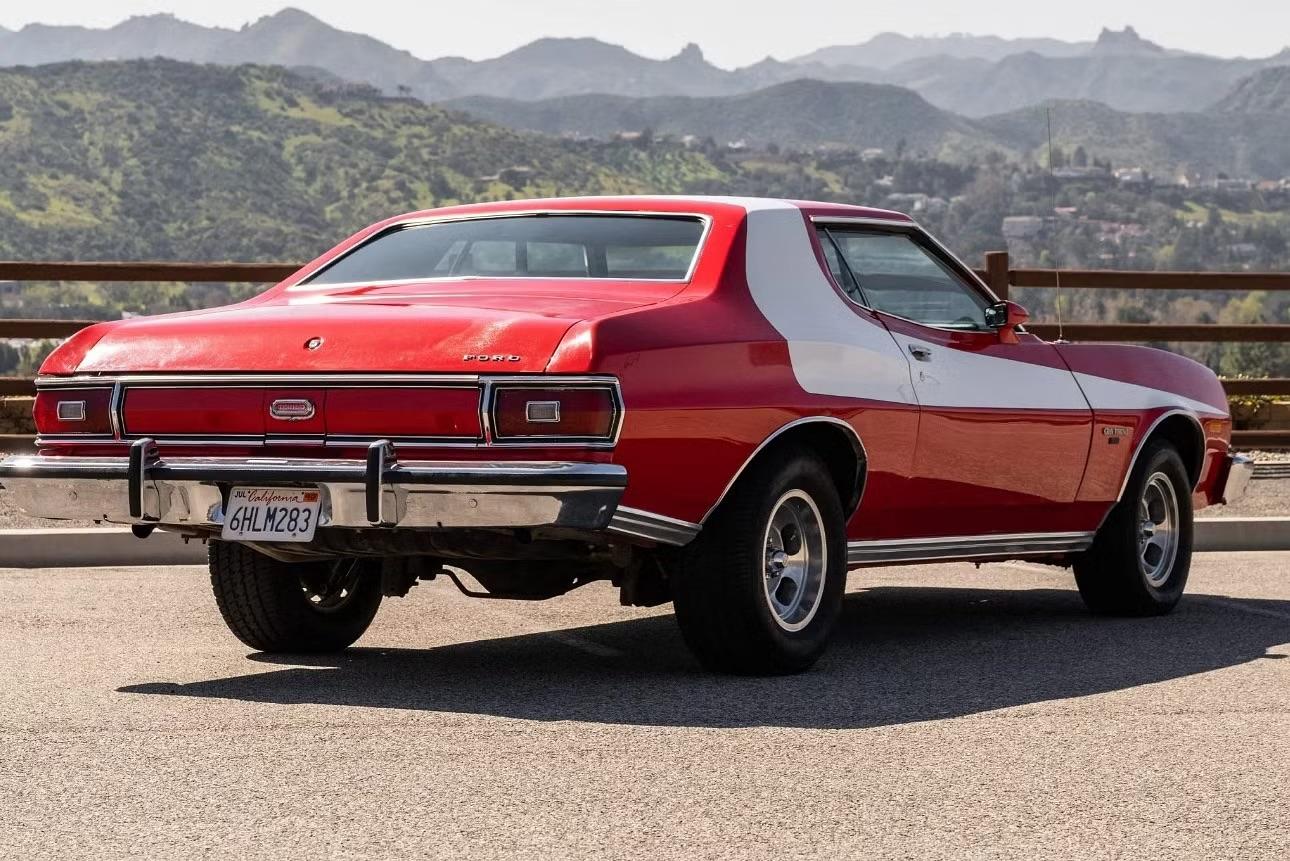 Il laterale schiacciato si dimostra massiccio grazie al largo uso dei lamierati rispetto alla superficie vetrata e delle due porte anche dei cerchi da 15 o 16 pollici che riempiono gli importanti passaruota che sprigionano cattiveria da tutti i pori. Il lungo posteriore risulta essere degno della Ford Torino di serie, si trova infatti il classico lunotto tagliato che non include alcun spoiler, ma lascia spazio all’immancabile fanaleria rettangolare che esalta le linee massicce di questa Ford Gran Torino. Nella parte inferiore si trovano i due ponenti scarichi cromati che fanno sentire l’inconfondibile rombo della Gran Torino.